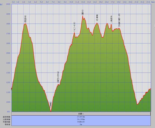累計歩行距離 24.138km 累計標高差 2350m ( etrex-legend Jで計測後、乱れたログは手動補正して計算)