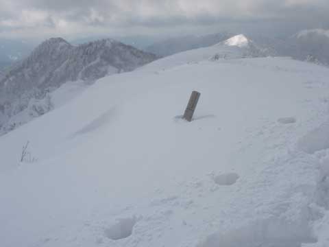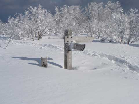 矢筈山山頂 「マイナス10.7度 西風5m 曇り しばらくして ガスがとれ 三嶺 天狗塚 剣山 次郎笈などが 見える。祖谷谷は真っ白。」