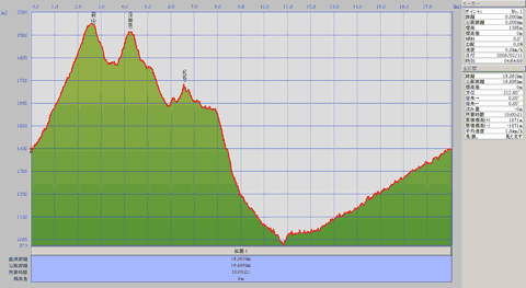 見ノ越 駐車地点発 4:55 --剣神社 4:58 --西島リフト駅 5:51 --- 剣山 (6:58-7:09)--次郎笈 (8:28-8:57)---スーパー林道下降点 9:59--丸石 (10:40-11:09)---丸石避難小屋 (11:47-12:19)--奥祖谷かずら橋下降点 12:21--国体橋 12:51---奥祖谷かずら橋 国道439号 13:18-----見ノ越 駐車地点着 14:53