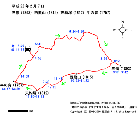 HOME > 山行記録 >三嶺(1893) 西熊山(1815) 天狗塚(1812) 牛の背(1757)> 平成22年2月7日