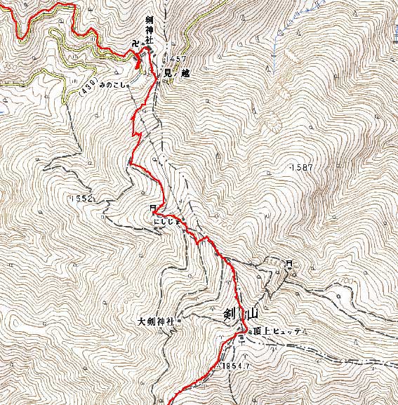 赤色は平成17年10月9日に見ノ越、剣山、三嶺、と周回し、塔の丸から夫婦池へ下山し、見ノ越へ戻る時のGPSトラックログである。