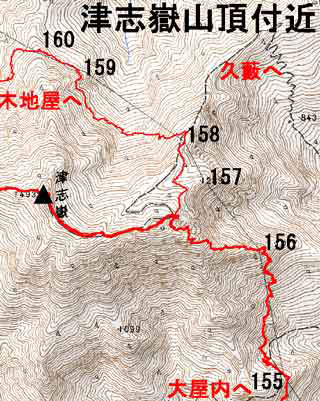 津志嶽山頂(1494) 山頂付近の 登山道の表示、ここも 随分 違っている。久藪 木地屋 大屋内への道があるが それぞれ登山道と違い 電力会社の管理する 電力鉄塔保守点検路を 登山者が ちょっ貸してくださいと通る部分がある。登山者の 感覚とは大幅に違う道、それだから 間違いが起こり易い。