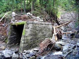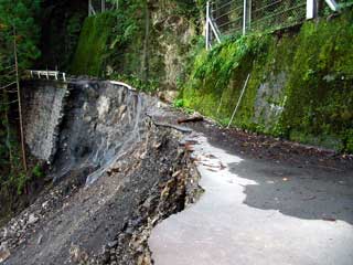 日本一の雨量の代償か 道路決壊 膨大な水が流れ 道路を押し流す 静かな ひっそりとした周りの環境である。