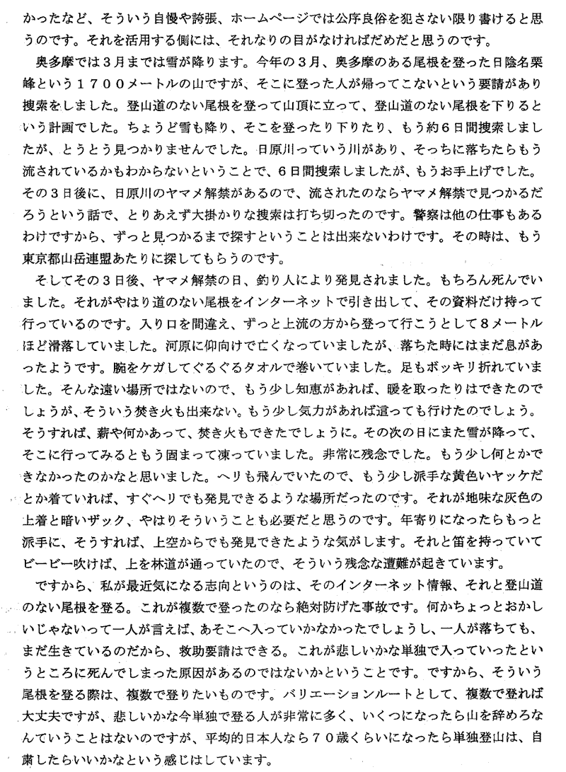 金 邦夫氏(警視庁)が指摘する インターネットに起因する 遭難事故 日蔭名栗山(1725m)2004年3月
